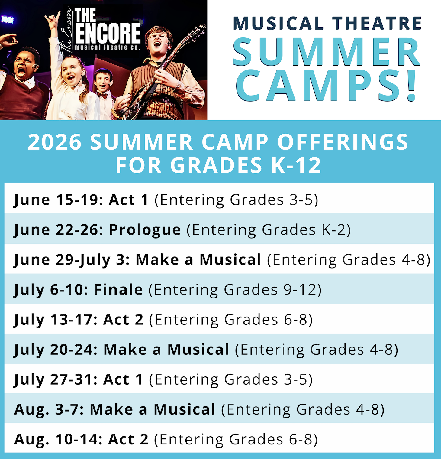 Give your child the gift of confidence, creativity, and fun at The Encore Musical Theatre’s Summer Camps! Led by David Moan and an incredible team of theatre professionals, campers will explore the magic of musical theatre through singing, dancing, acting, and improvisation—all while building teamwork and communication skills.